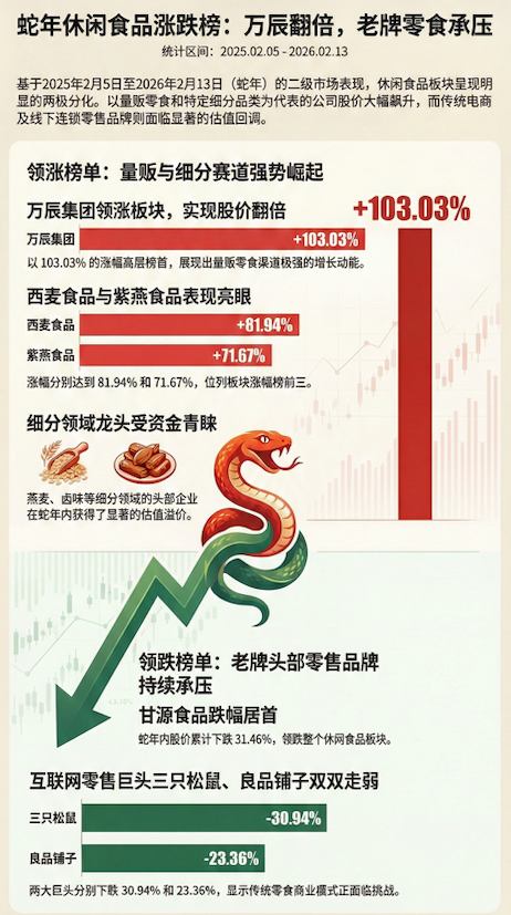行将已往的蛇年,舒服食物板块呈现出显著的“结构性怡悦”。笔据东方资产Choice统计,A股23家主要舒服食物公司中,有14家好意思满飞腾,占比约61%;9家出现着落,占比39%。板块全体回暖态势显著,尤其是零食量贩赛谈分解尤为拉风。