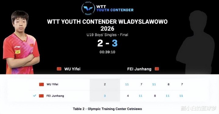 北京时分3月8日,WTT青少年老例挑战赛弗瓦迪斯瓦沃沃站U19男单决赛,费浚航3-2逆转伍毅菲夺冠,五局比分:【4-11,11-7,8-11,11-8,11-7】。此役19岁的费浚航在大比分0-1、1-2逾期的情况下完成逆转,第四局与第五局费浚航齐得到较为简略。
